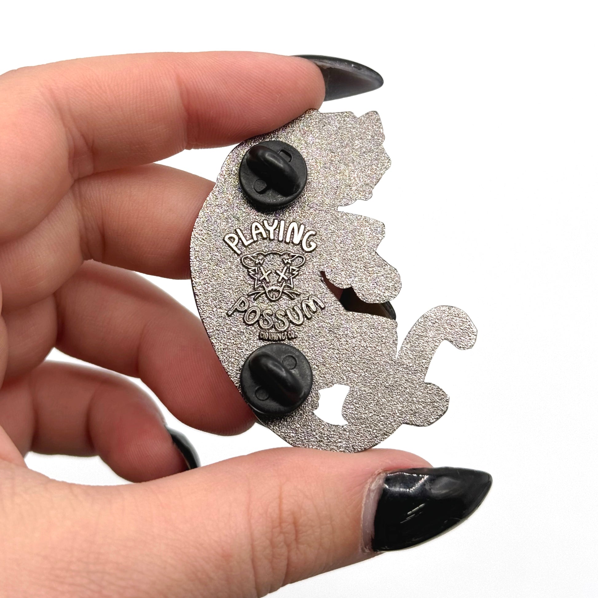 A 2 inch, hard enamel, enamel pin with black plating, printed details and two posts.