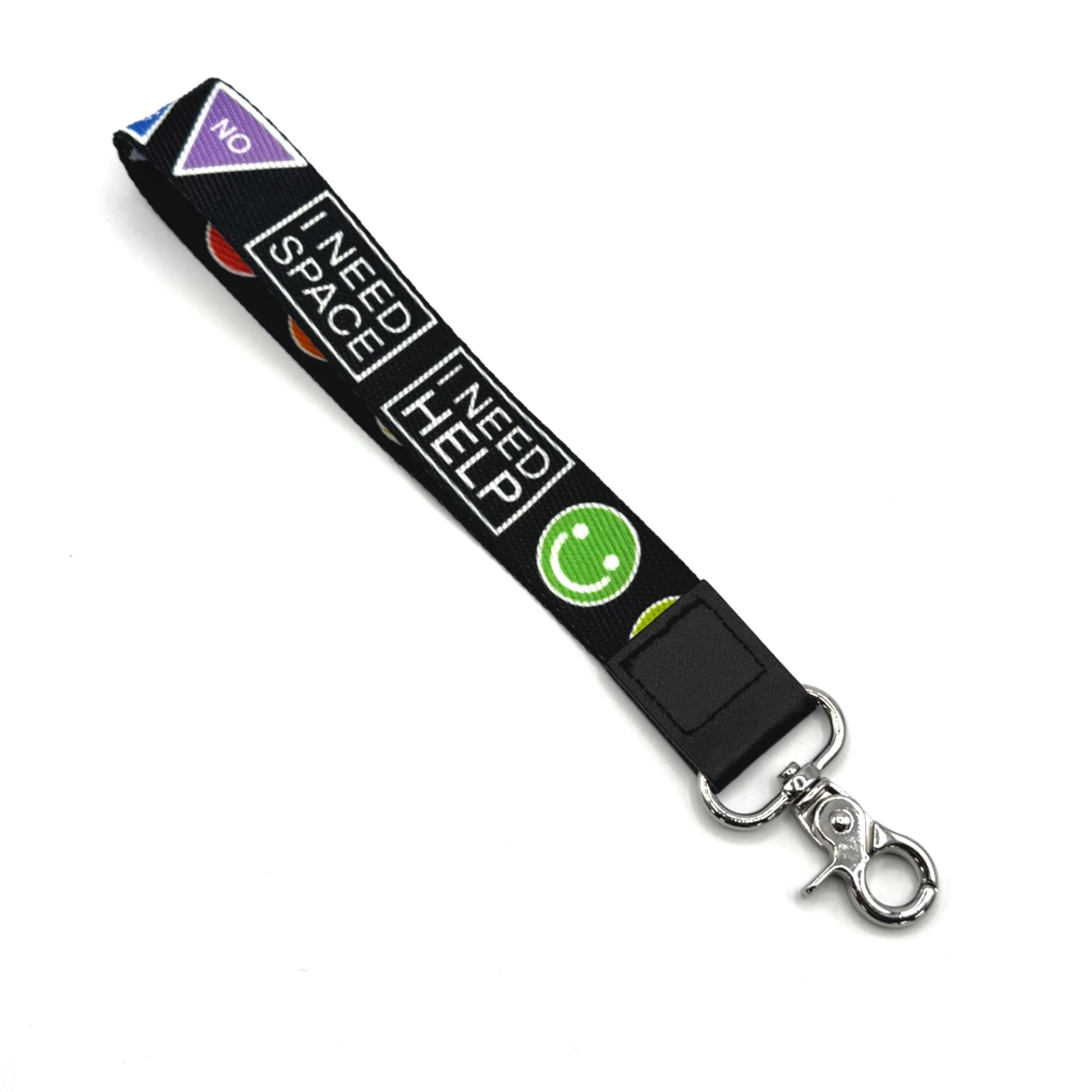 A printed 8.5 inch wristlet featuring heady duty silver hardware and a sewn leather buckle stamped with our logo. Printed with large symbols to assist in facilitating nonverbal communication.