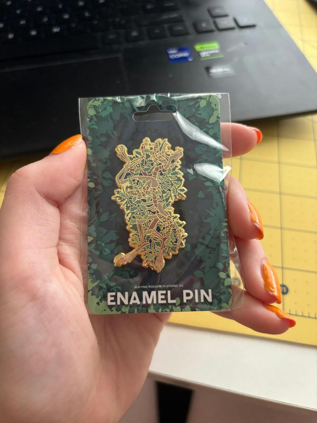 A 2 inch, hard enamel, enamel pin with black plating, printed details and two posts.