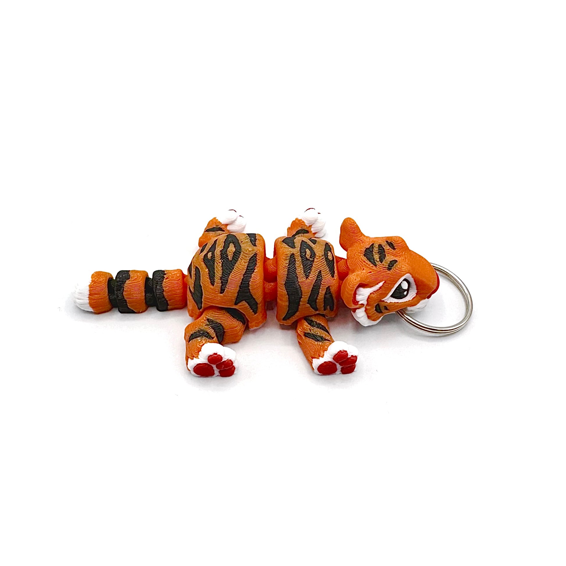 An adorable, articulated, 4 inch long, fidget tiger keychain. It is sturdy and printed in full color with an articulated body, tail and legs. Large enough to comfortably fidget with in hand, yet small enough for keys, lanyards or backpacks.