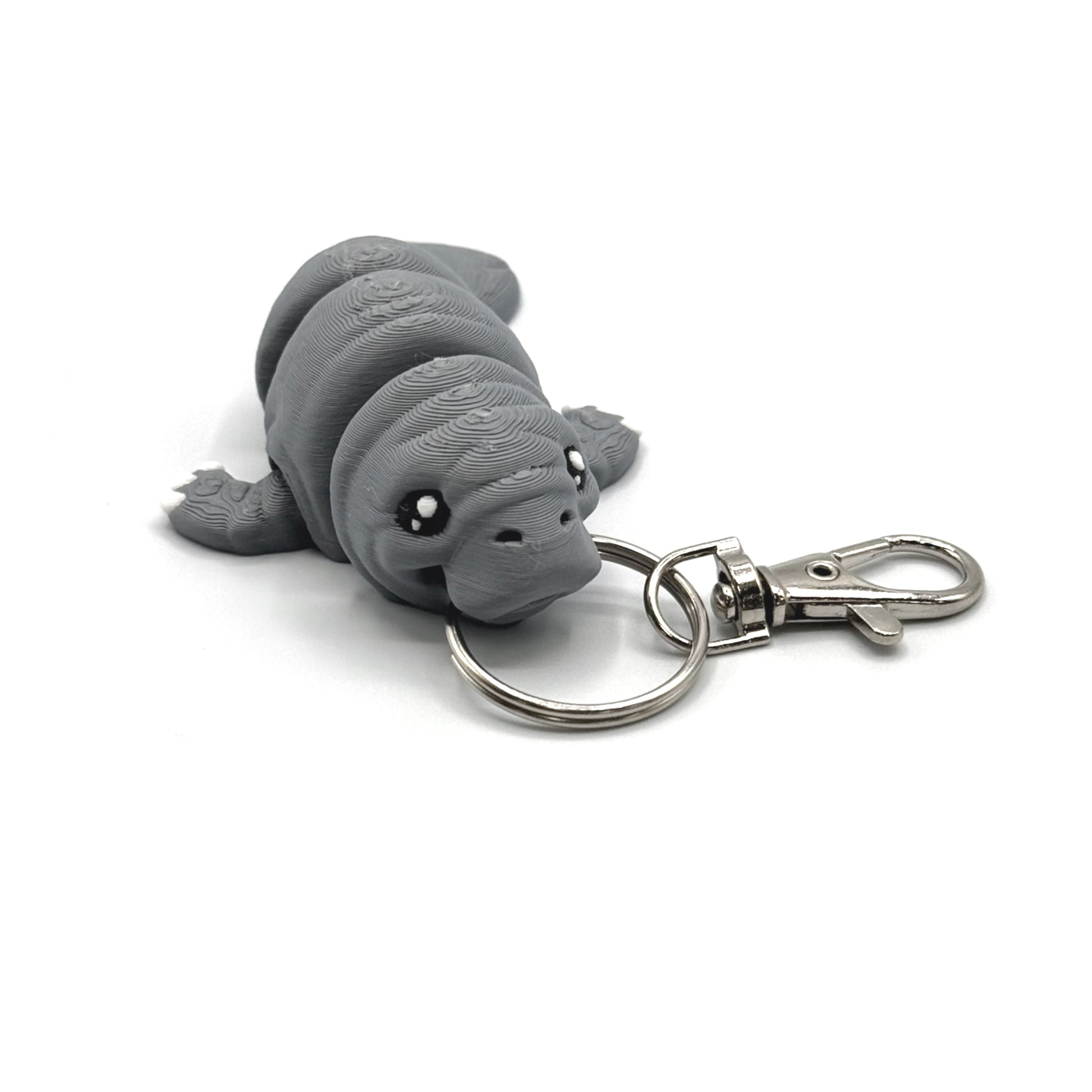 An adorable, articulated, 4 inch long, manatee frog keychain. It is sturdy and printed in full color with an articulated body and fins. Large enough to comfortably fidget with in hand, yet small enough for keys, lanyards or backpacks.