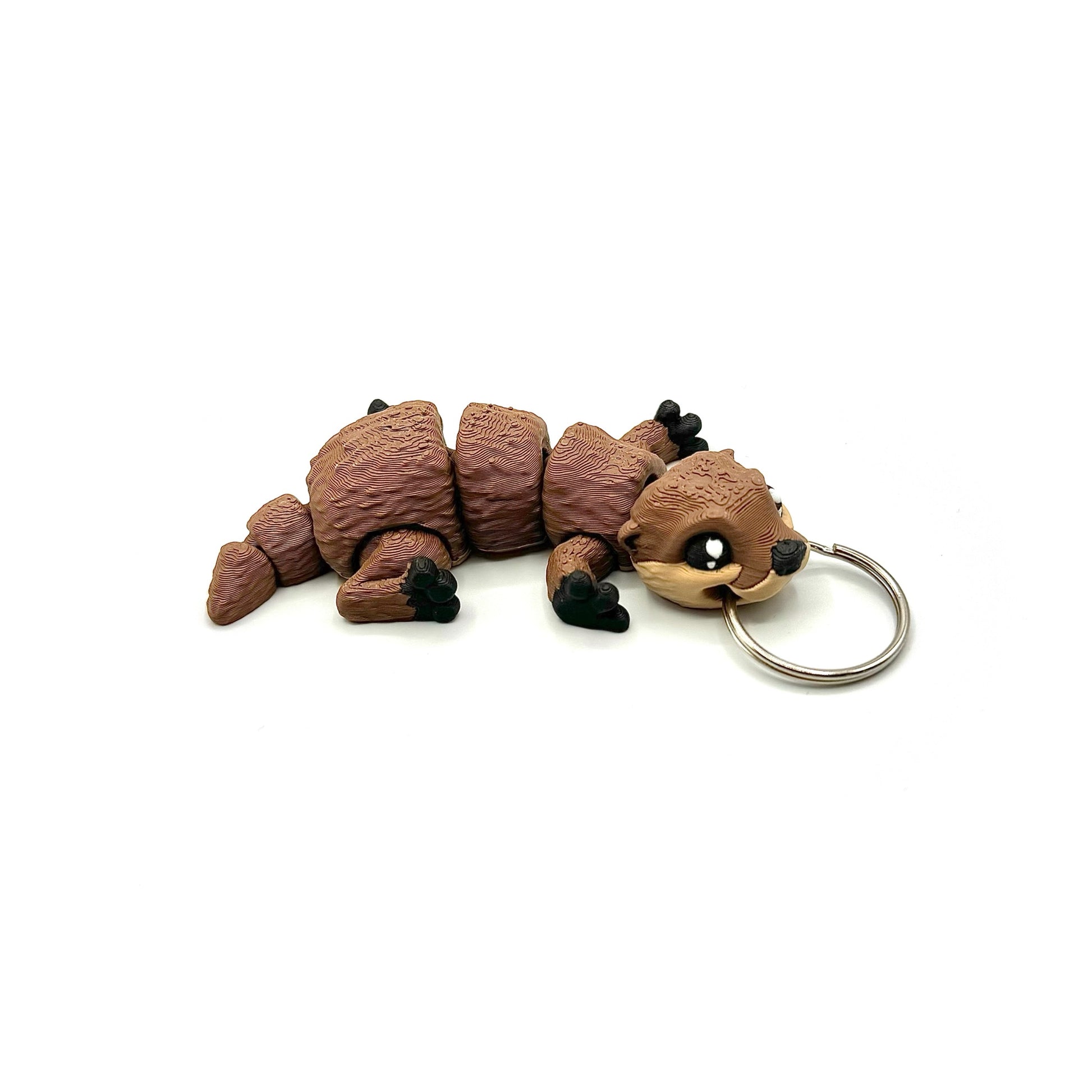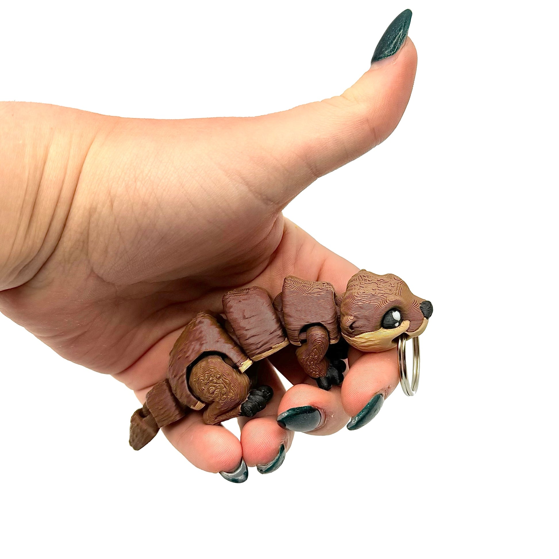 An adorable, articulated, 4 inch long, fidget otter keychain. It is sturdy and printed in full color with an articulated body, tail and legs. Large enough to comfortably fidget with in hand, yet small enough for keys, lanyards or backpacks.