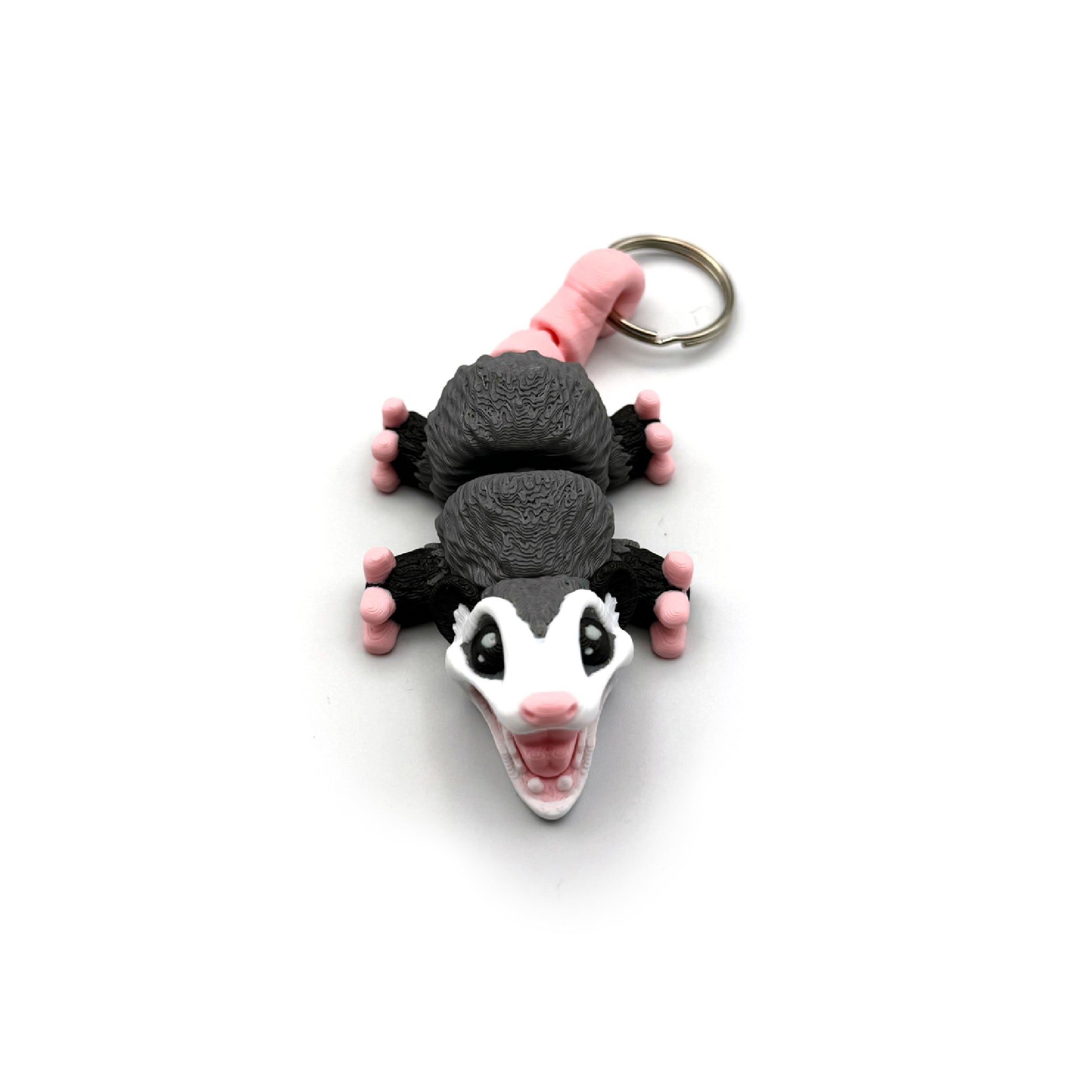 An adorable, articulated, 4 inch long, fidget possum keychain. It is sturdy and printed in full color with an articulated body, tail and legs. Large enough to comfortably fidget with in hand, yet small enough for keys, lanyards or backpacks.
