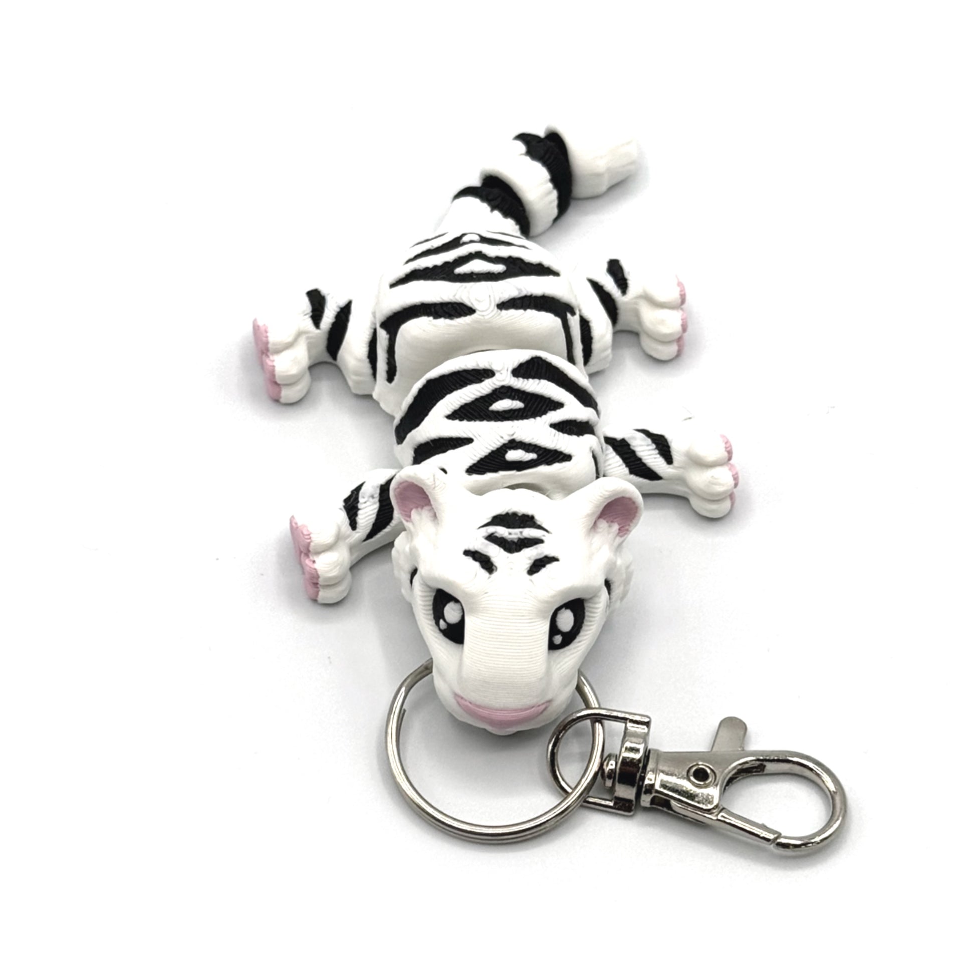 An adorable, articulated, 4 inch long, fidget tiger keychain. It is sturdy and printed in full color with an articulated body, tail and legs. Large enough to comfortably fidget with in hand, yet small enough for keys, lanyards or backpacks.