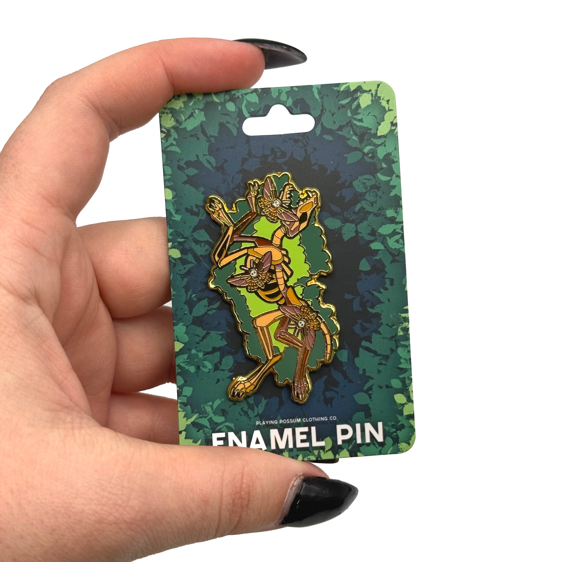 A 2 inch, hard enamel, enamel pin with gold plating, printed details and two posts.