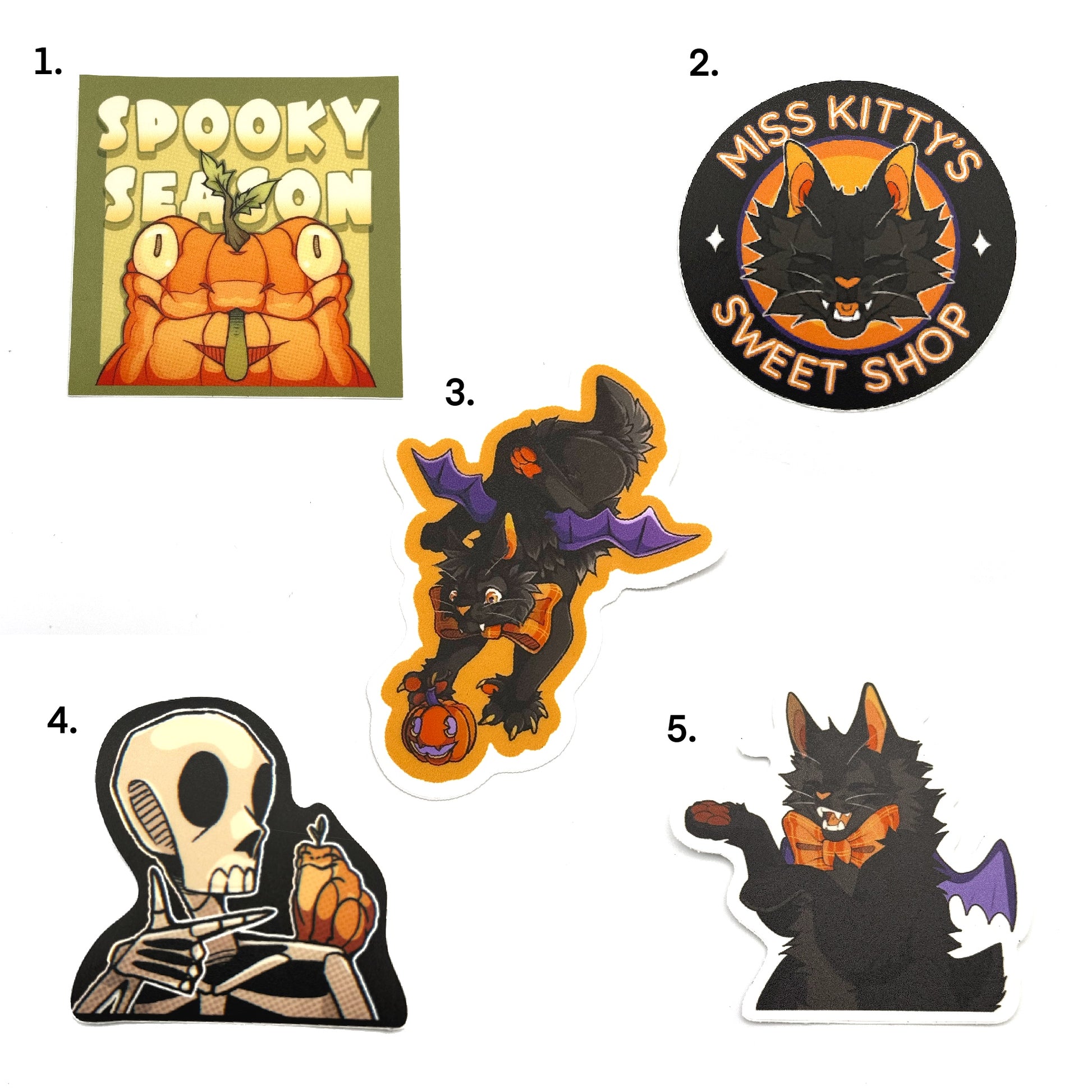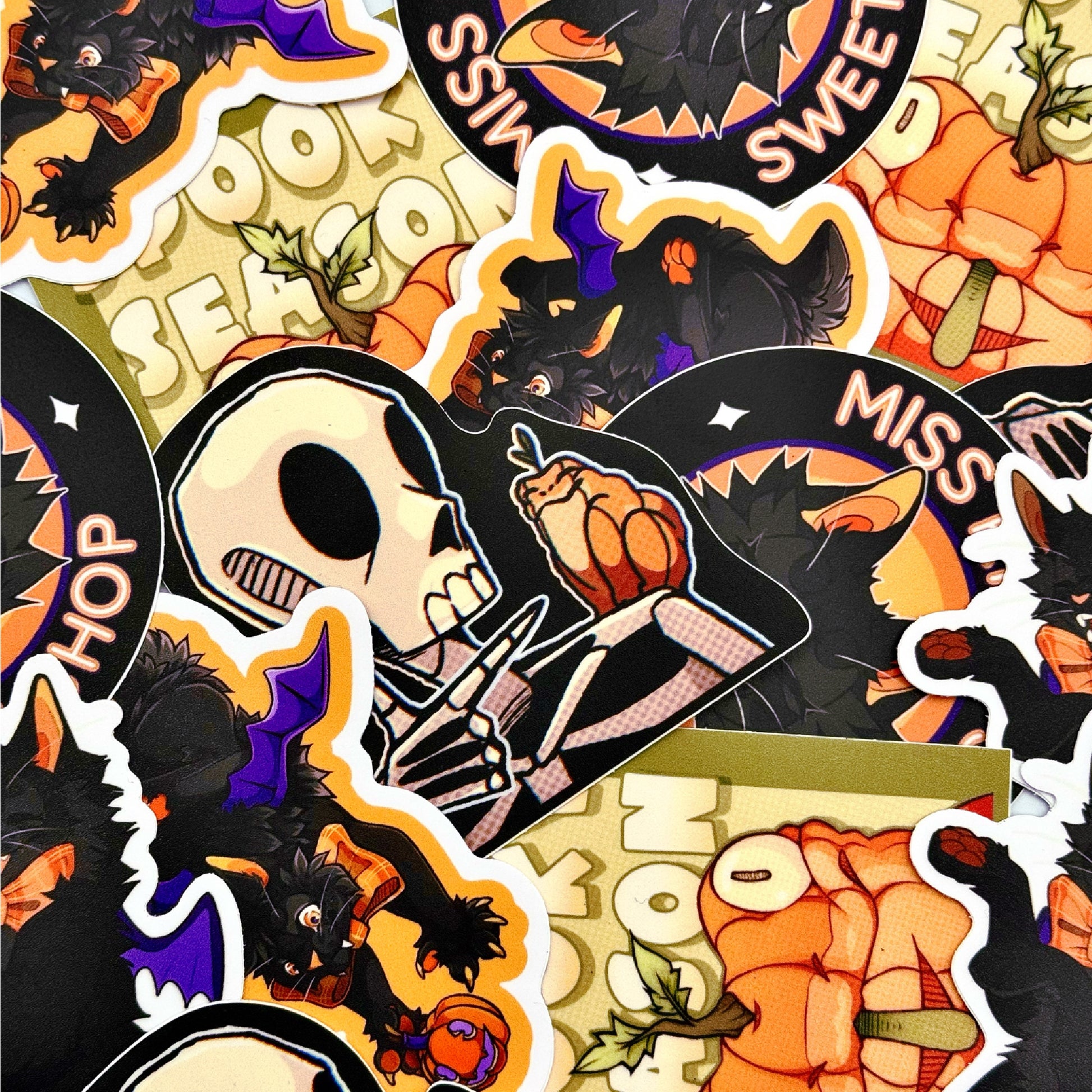 A spooky assortment of 2.5-3 inch stickers made of heavy duty vinyl, and made with recycled backing paper.