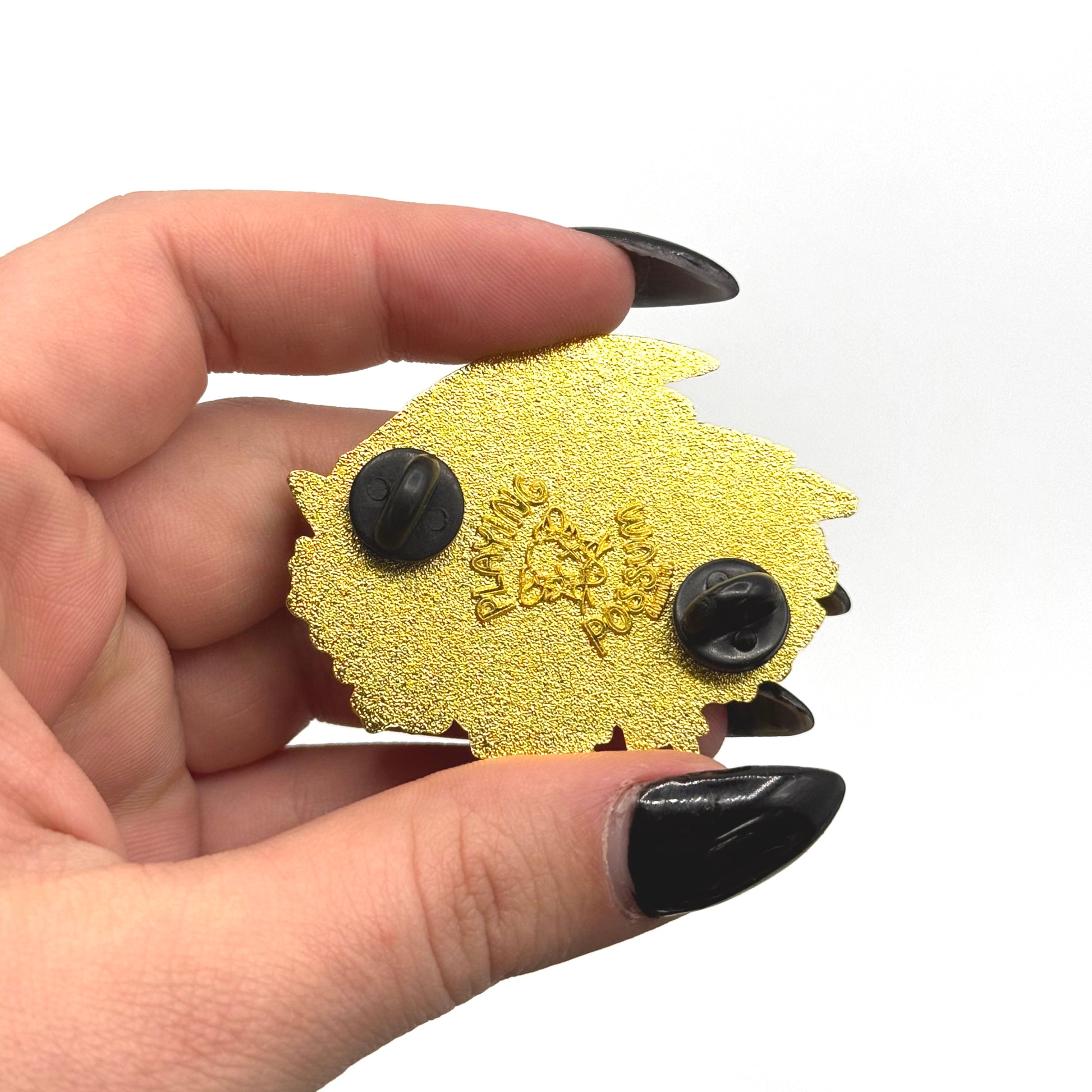 A 2 inch, hard enamel, enamel pin with gold plating, printed details and two posts.