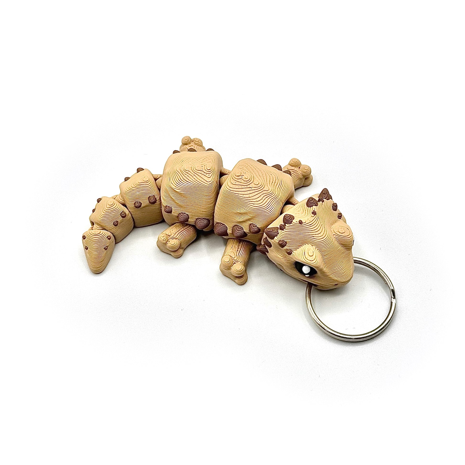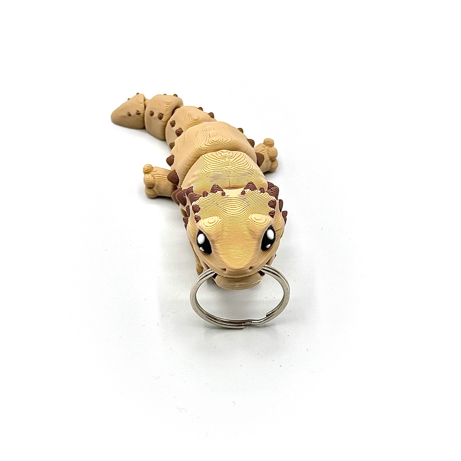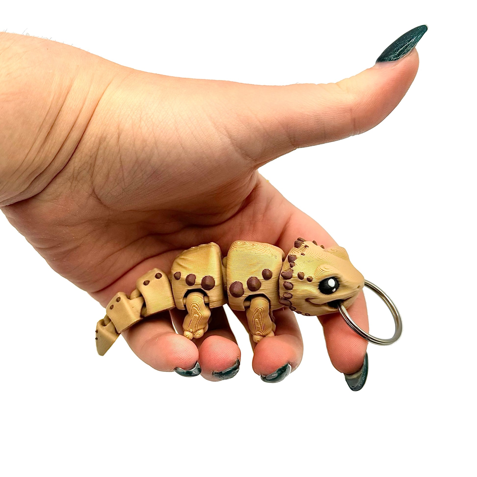 An adorable, articulated, 4 inch long, fidget bearded dragon keychain. It is sturdy and printed in full color with an articulated body, tail and legs. Large enough to comfortably fidget with in hand, yet small enough for keys, lanyards or backpacks.
